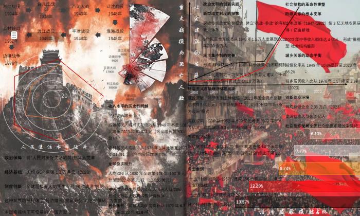 该作品以以红黑色调为主,体现的是发生战役党的艰难历程,和历尽艰苦后的胜利和繁荣。作者运用Python形成一系列可视化图表,采取了南丁格尔玫瑰图体现每场战役的死亡人数的可视化图,使用雷达图的形式展现出人民生活的水平提升,折线图更好的展示社会建设的发展,使用条形图展现了经济发展的进程,这些可视化图表都直观清晰的展现了数据背后党的付出。党的历史不仅是时间轴上的事件集合,更是一个由军事斗争、经济建设、空间改造共同构成的立体演进系统。这种可视化实践,本质上是在进行"历史规律的数学表达"尝试。
