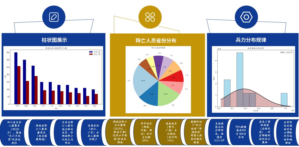 本作品使用PowerBI构建交互式仪表盘,运用Pandas库进行数据建模,通过Matplotlib实现可视化,从多维度揭示历史意义。通过剖析户籍数据,展现全民抗战动员下军民一体的紧密联系,深入探讨其在战争进程中发挥的关键作用;同时聚焦物资调配能力,分析其对长期作战的支撑效能,挖掘资源保障于战争中的核心价值;此外,借助饼图与柱状图直观量化牺牲情况,以数据为依托,呼吁大众铭记历史,传承与弘扬英雄精神。