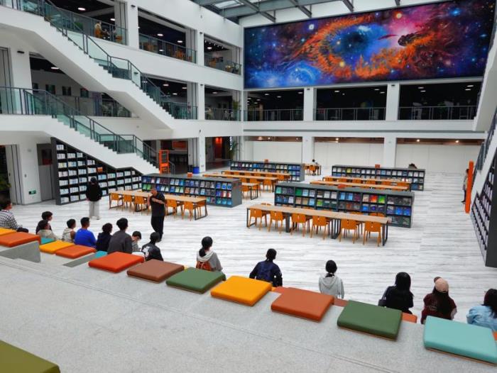 跟随馆长的解说,同学们来到图书馆中庭。阶梯式分布的彩色软座,惹人注目,坐下就能看到三楼的巨幅油画《探索》。画作立意激励学子勇于超越自我、专注科研探索,传递出学校“教育创造学生价值”的办学理念。活动的最后阶段,同学们自主参观了二、三楼学习区,初步规划未来的自习空间。