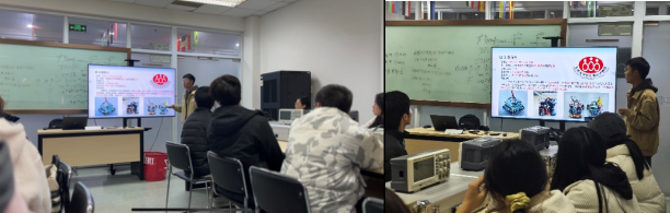 活动开始,信息与电子工程系信号与系统实验室老师黄绮梦致欢迎辞。核心分享环节,金钰鑫老师结合自身斩获电子设计大赛四川省一等奖的实战经验,围绕竞赛项目内容展开核心交流,从赛事认知、备赛策略、项目实战技巧三个维度进行介绍。他首先细致解读了电子设计大赛的核心规则、评分细则、热门选题方向及近年赛事发展趋势,重点剖析了不同竞赛项目的难度差异与备赛侧重方向,帮助同学们快速建立对赛事及项目内容的整体认知框架。