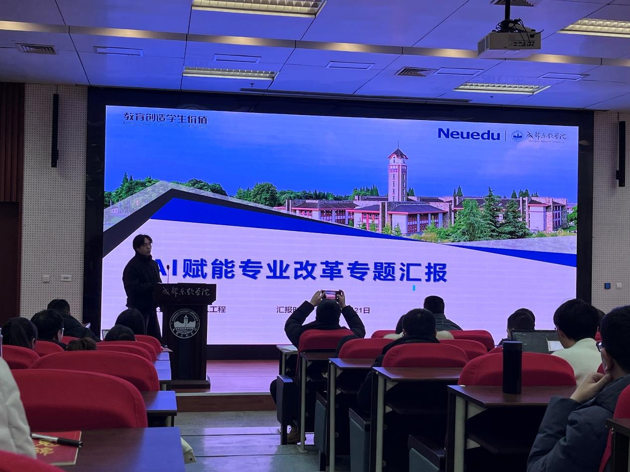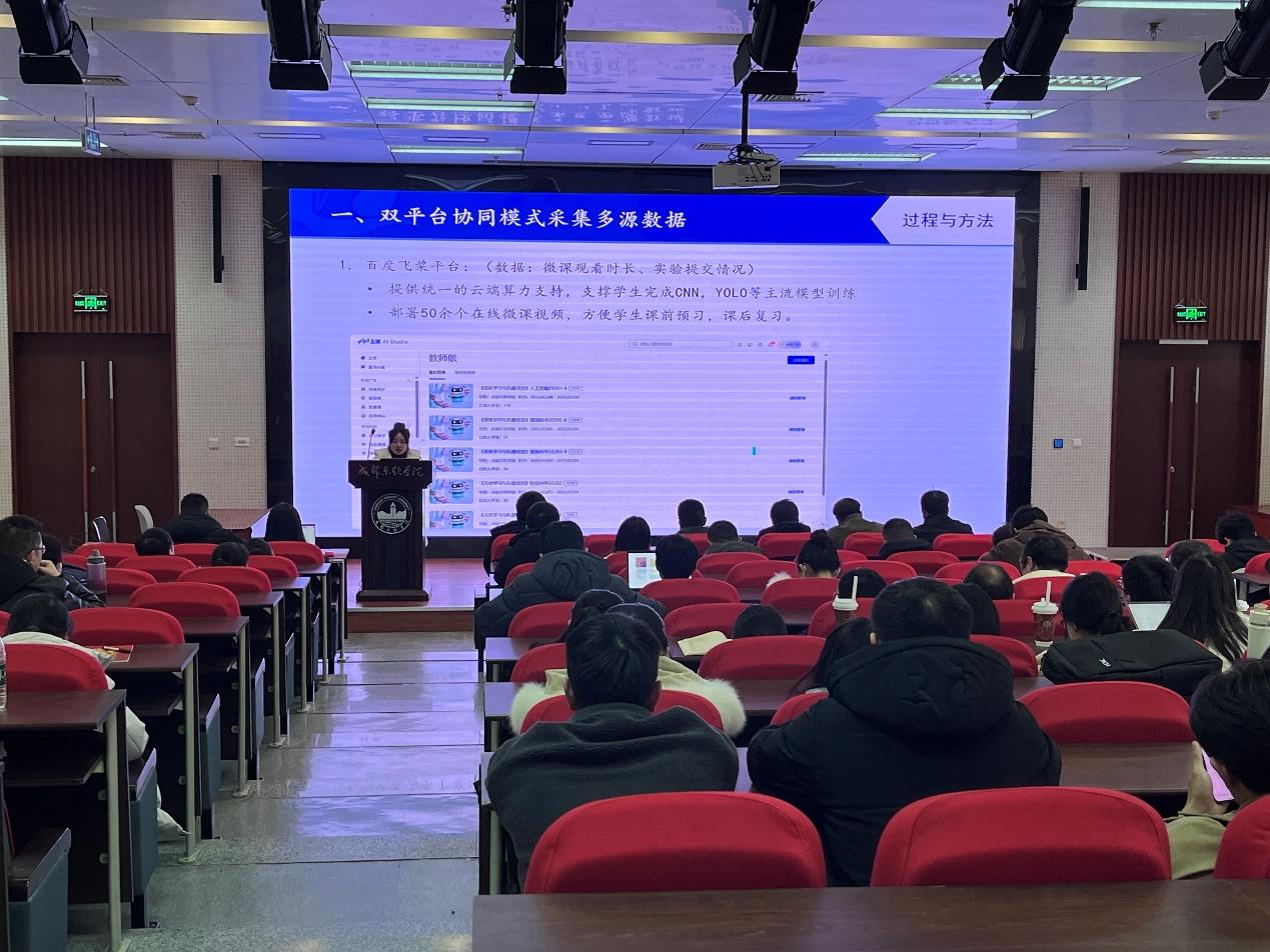 会议上半场,各系教师代表分享了AI赋能教学的创新实践成果。唐老师团队依托百度飞桨与东软智慧教育双平台,构建包含57个知识点的课程知识图谱,整合300余个题库资源,通过动态学情报告实现精准教学,课程已覆盖 800余名学生,斩获四川省高阶课程建设立项、校级教研教改项目等多项成果。